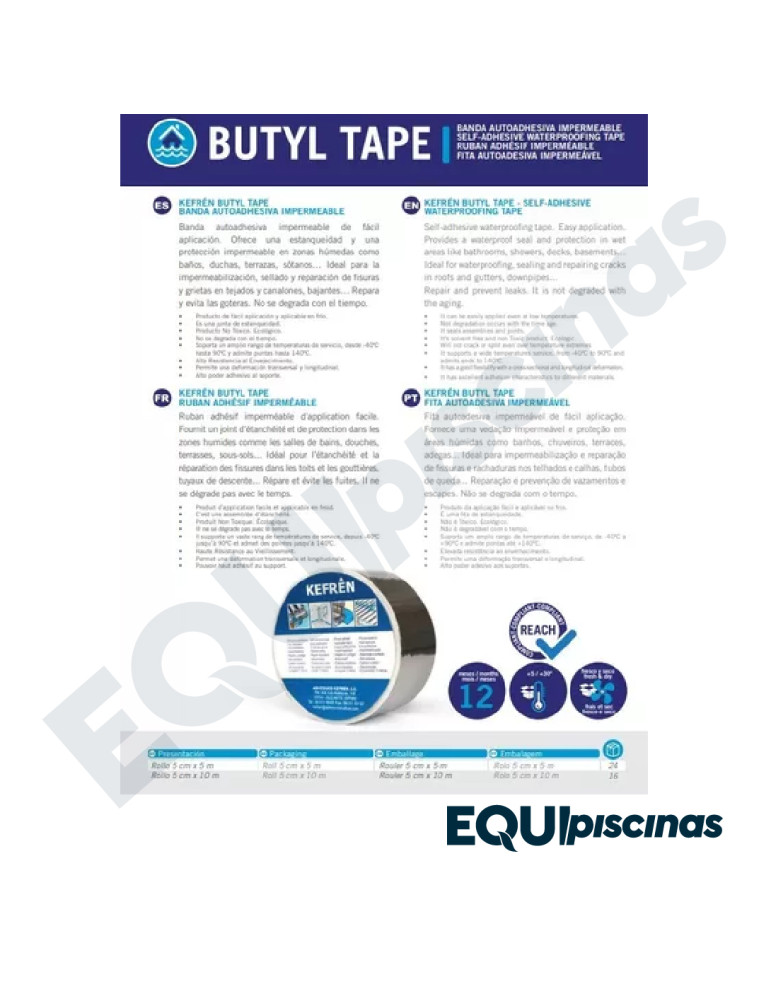 • Banda de sellado autoadhesiva compuesta por un complejo de Aluminio y Caucho Butilo. Ofrece una estanqueidad y una protección impermeable en zonas húmedas como baños, duchas, terrazas, sótanos, juntas, etc.