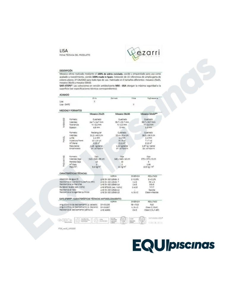 1) MARCA: EZARRI; PRESTIGIOSO FABRICANTE Y REFERENTE MUNDIAL EN MOSAICO DE VIDRIO; PRODUCTO 100% CERTIFICADO Y 100% EUROPEO; EN VENEZUELA DESDE HACE MÁS DE 30 AÑOS CON CALIDAD ABSOLUTAMENTE COMPROBADA