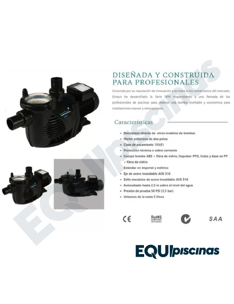 3) CONOCIDA POR SU REPUTACIÓN DE INNOVACIÓN Y EN BASE A LA OPINIÓN DEL MERCADO, EMAUX HÁ DESARROLLADO LA SERIE SPH SUPER POWER RESPONDIENDO A UNA LLAMADA DE LOS PROFESIONALES EN EL SECTOR DE LAS PISCINAS CON EL OBJETIVO DE OBTENER: UNA BOMBA CONFIABLE, RESISTENTE, DE GRAN PERFORMANCE Y ECONÓMICA SIN MENOSCABO DE LA CALIDAD PREMIUM, IDEAL PARA INSTALACIONES NUEVAS Y/O RENOVACIONES.