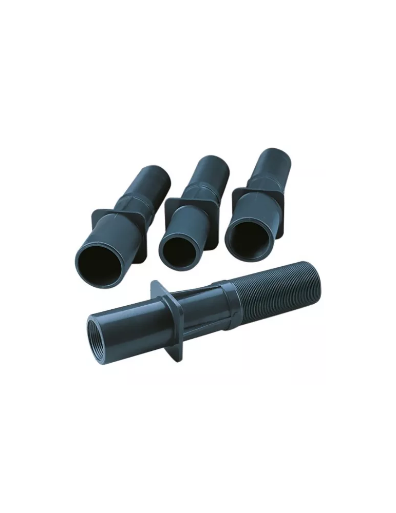 -DISEÑADOS CON UNOS ORIFICIOS EN LOS NERVIOS DE LA VALONA QUE PERMITE POSICIONAR EL PASAMURO A LA ESTRUCTURA DE LA PISCINA, SIMPLIFICANDO LA INSTALACION DE ROSCA EXTERIO 2" X 50MM ESPECIAL PARA BOQUILLAS
