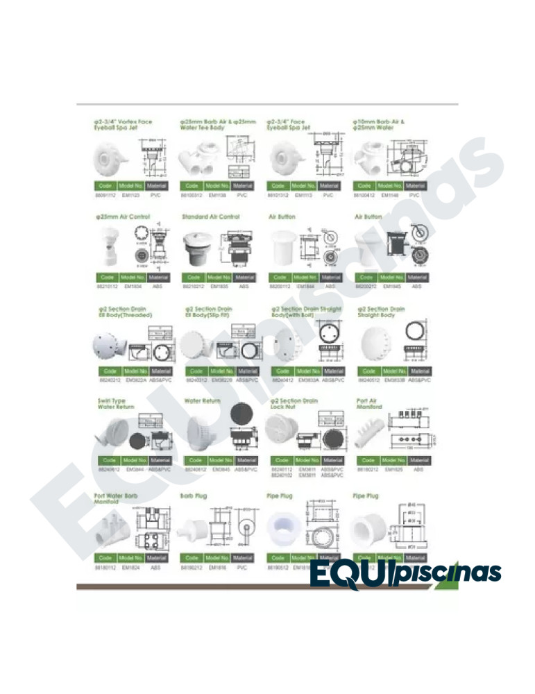 - Las boquillas de impulsión (RETORNO), succión, aspiración, hidromasajes, reguladores, rejillas, etc. están diseñadas para piscinas de concreto, fibra de vidrio y vinilo