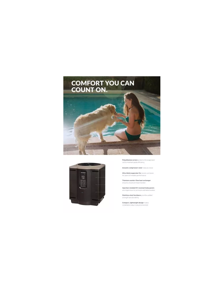 - Las bombas de calor HeatPro de alto rendimiento con ahorro de energía mantienen la temperatura ideal del agua de forma económica y silenciosa, en todo momento.