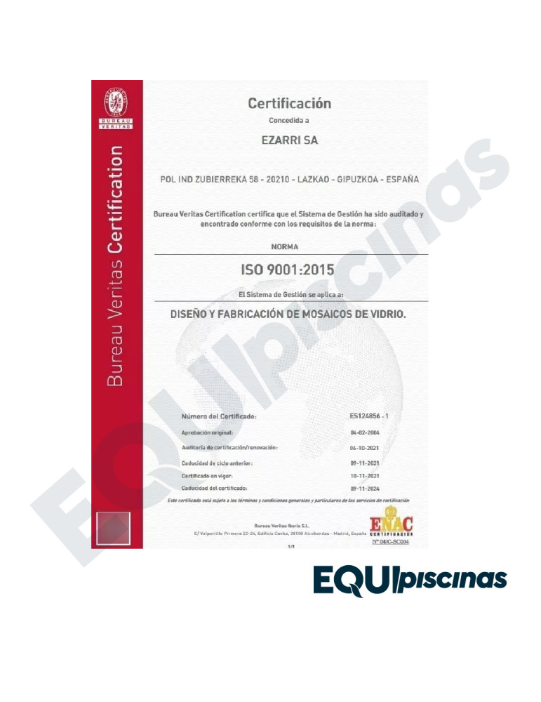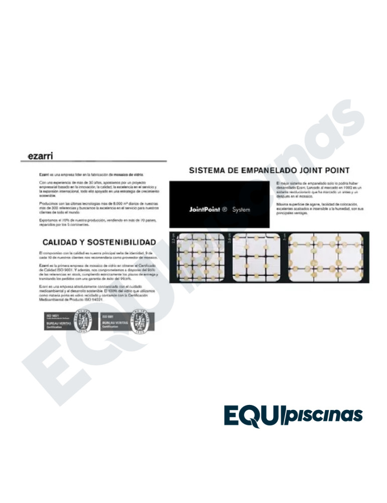 1) MARCA: EZARRI; PRESTIGIOSO FABRICANTE Y REFERENTE MUNDIAL EN MOSAICO DE VIDRIO; PRODUCTO 100% CERTIFICADO Y 100% EUROPEO; EN VENEZUELA DESDE HACE MÁS DE 30 AÑOS CON CALIDAD ABSOLUTAMENTE COMPROBADA