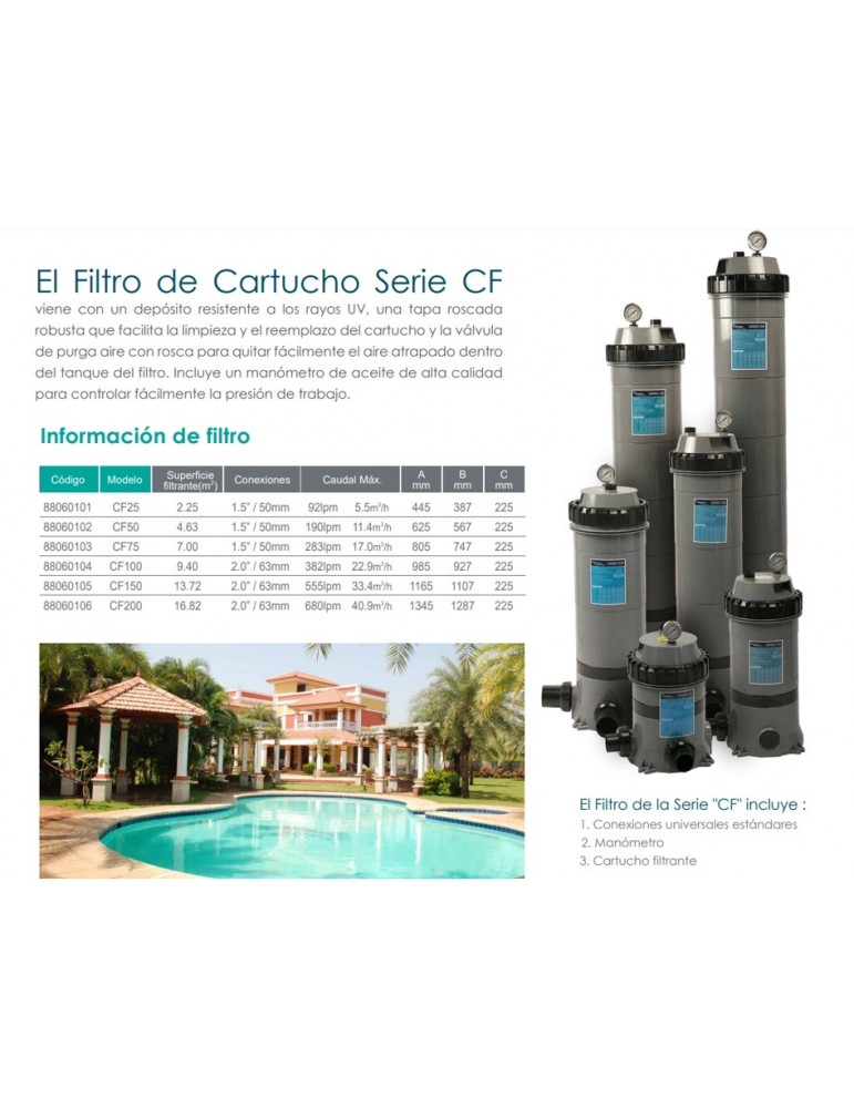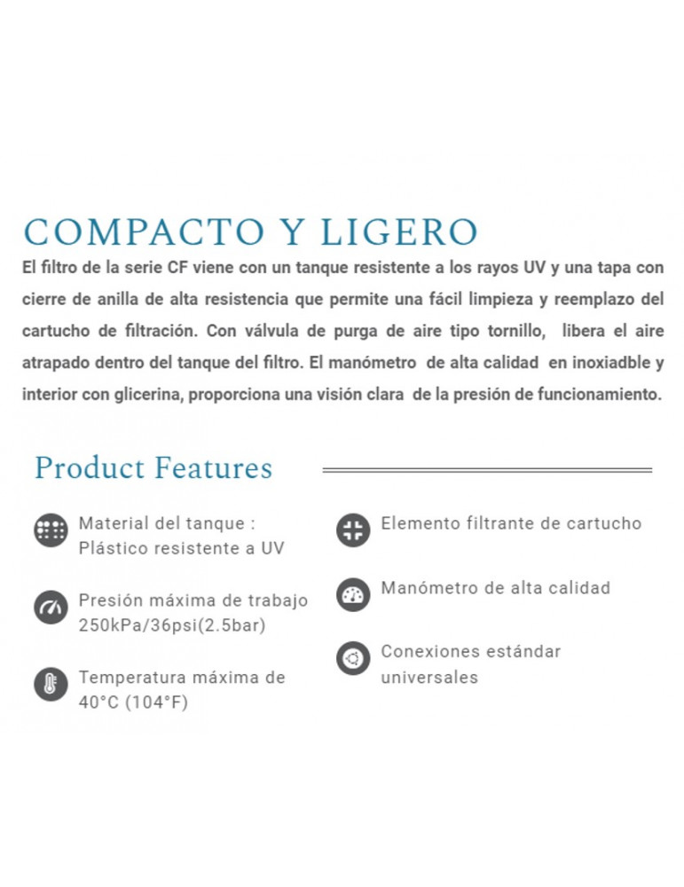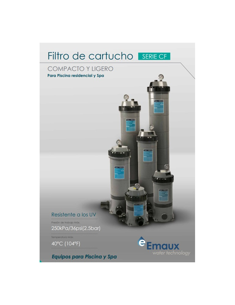 1) FILTRO EMAUX SERIE CF ES UN EQUIPO DE ALTOS ESTÁNDARES DE RENDIMIENTO DE FILTRACIÓN. FABRICADO EN PLÁSTICO DE ALTA RESISTENCIA CON PROTECCIÓN UV