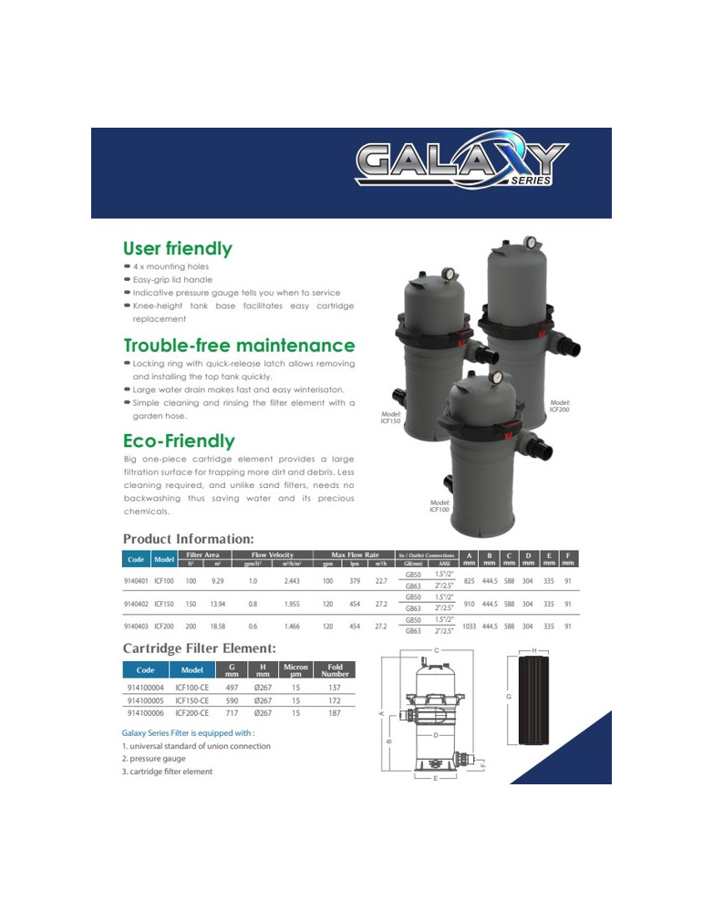 FILTRO DE CARTUCHO EMAUX GALAXY 100 ALTO RENDIMIENTO (100GPM / 379Lts/Min) PISCINAS HASTA 140m3