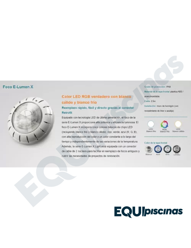 - La Caja de Control funciona con los Reflectores Led de última Generación Emaux E-Lumen X High Power. El foco E-Lumen X incorpora cinco colores básicos de chips LED (incluyendo blanco frío y blanco cálido), rojo, verde, azul (R, G, B), con alta reproducción del color y un color constante a lo largo del tiempo y independientemente de las variaciones de la temperatura. Además, la serie E-Lumen X Light está equipada con un conector de cable de 2 núcleos para facilitar el reemplazo de focos antiguos y cubrir las necesidades de proyectos de renovación.
