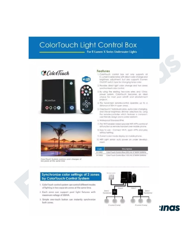 a) El cuadro de mando ColorTouch con control remoto proporcionan el cambio de color directo y el control sincronizado de dos zonas. Logra Sincronicar hasta 6 Reflectores por Zonja, en total HASTA 12 REFLECTORES (300W por Zona)