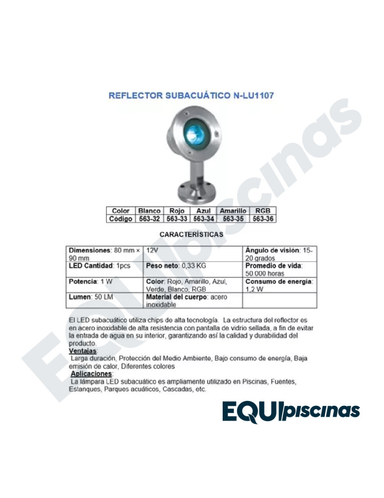 El LED subacuático utiliza chips de alta tecnología. La estructura del reflector es en acero inoxidable de alta resistencia con pantalla de vidrio sellada, a fin de evitar la entrada de agua en su interior, garantizando así la calidad y durabilidad del producto.