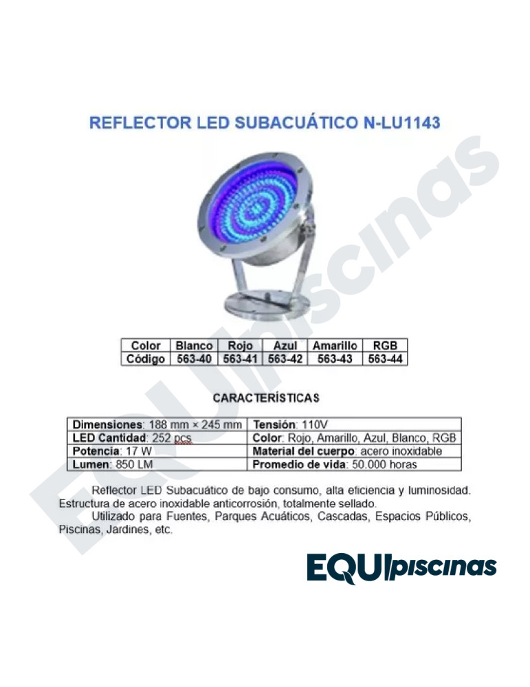 El LED subacuático utiliza chips de alta tecnología. La estructura del reflector es en acero inoxidable de alta resistencia con pantalla de vidrio sellada, a fin de evitar la entrada de agua en su interior, garantizando así la calidad y durabilidad del producto.