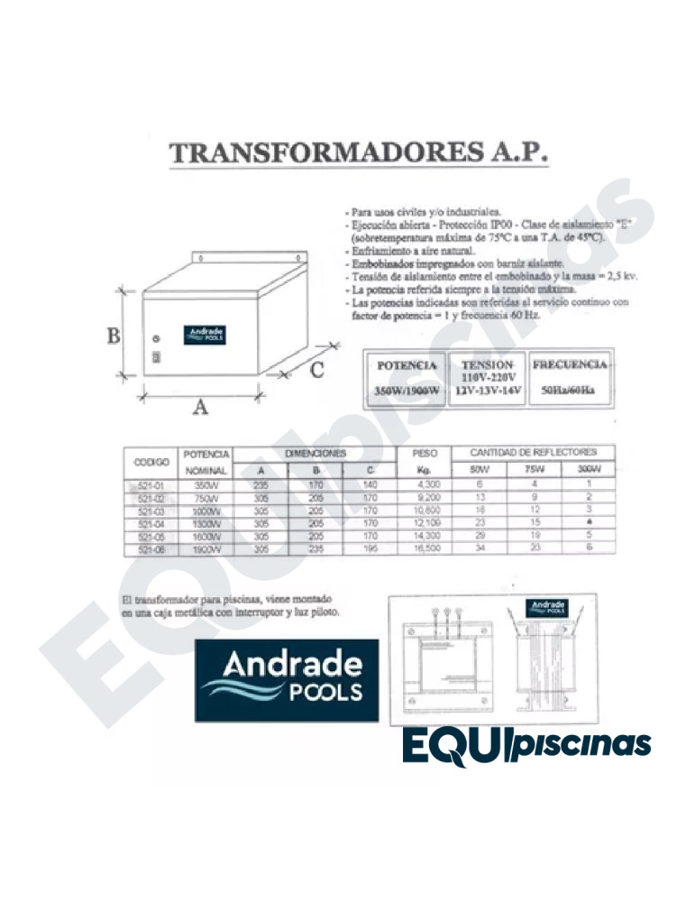 - EL TRASFORMADOR ESTÁ DISEÑADO PARA SU USO EN EQUIPOS PARA PISCINAS QUE REQUIEREN BAJO VOLTAJE, ES DECIR, 12V-13V-14V. HAY MODELOS PARA 24V.