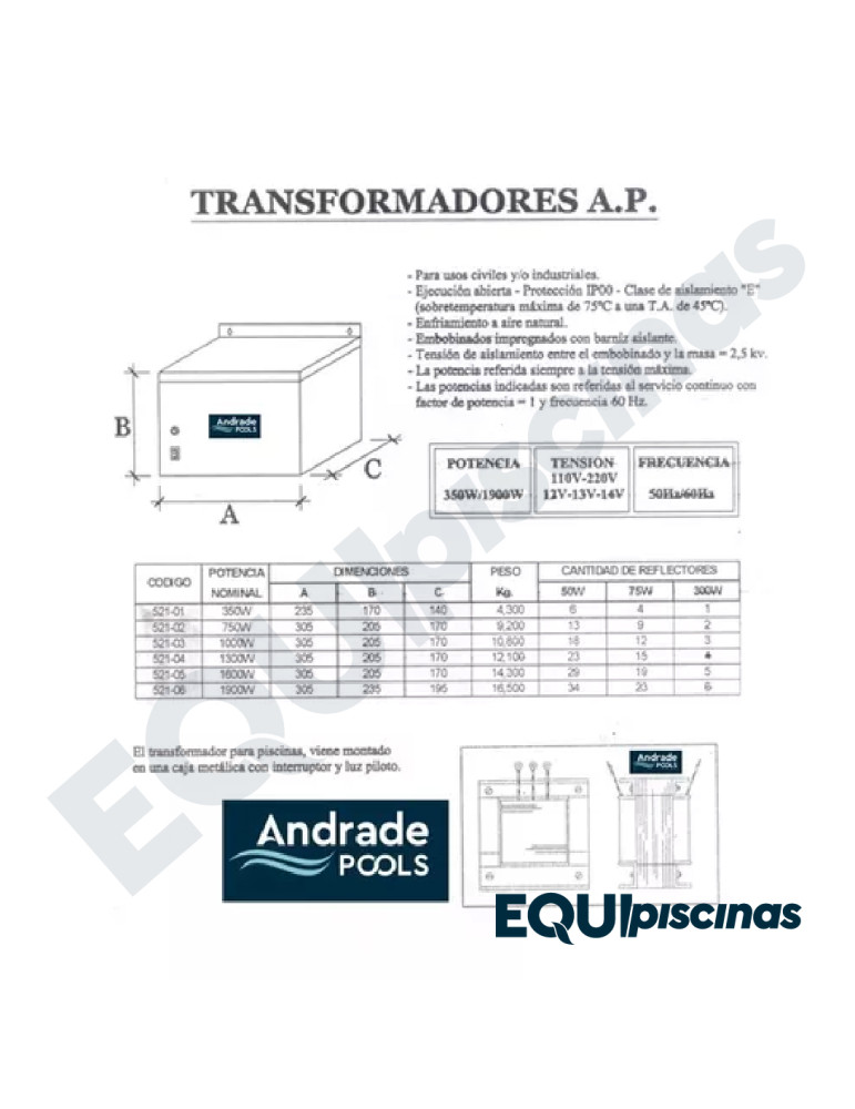 - EL TRASFORMADOR ESTÁ DISEÑADO PARA SU USO EN EQUIPOS PARA PISCINAS QUE REQUIEREN BAJO VOLTAJE, ES DECIR, 12V-13V-14V. HAY MODELOS PARA 24V.