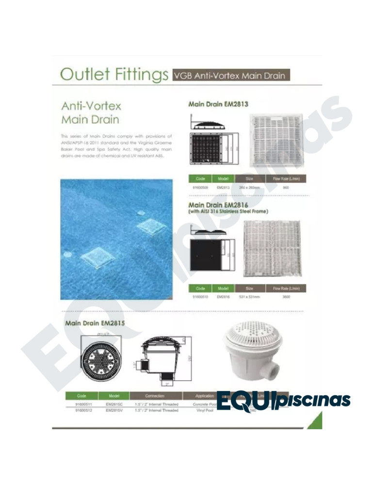 4) SEGURIDAD: La nueva línea de Sumideros Antivórtices "VGB" de Emaux cumple con las directrices del estándar ANSI / APSP-16 2011 y con el Acto de seguridad de Virginia Graeme Baker Pool & Spa, diseñado en EEUU para evitar los peligrosos atrapamientos.