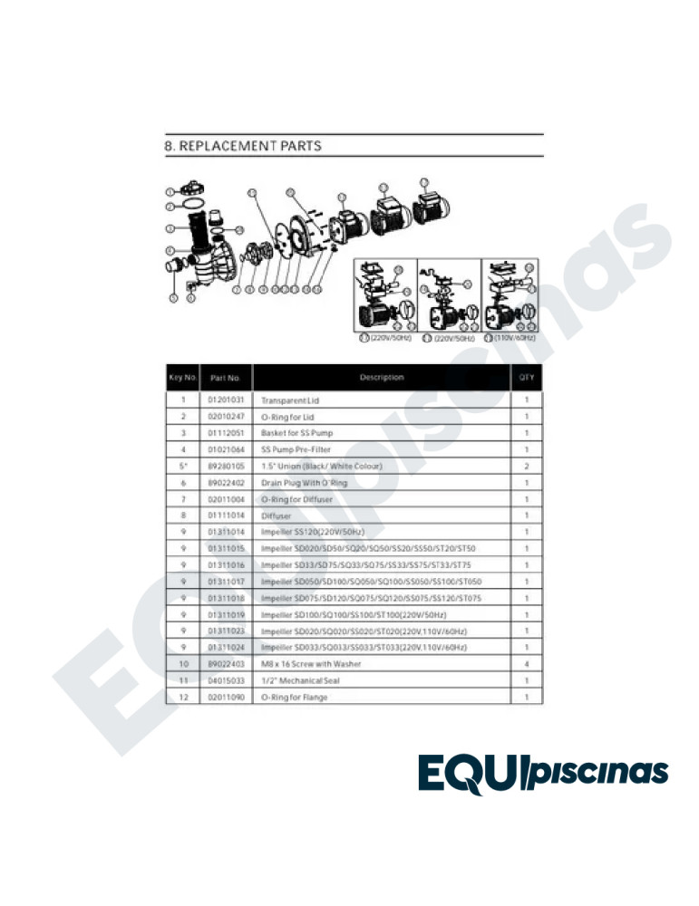 1) MARCA: ANDRADE POOLS; REPUESTO GENÉRTICO PARA BOMBAS EMAUX SERIE SS