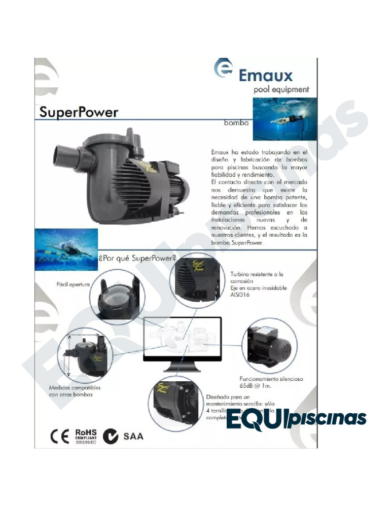1) MARCA: EMAUX; FABRICANTE MUNDIALMENTE RECONOCIDO Y PRESTIGIOSO EN EQUIPOS Y SISTEMAS PARA PISCINAS, FUENTES Y SPAS; PRODUCTOS CON CERTIFICACIONES DE CALIDAD EUROPEAS, AMERICANAS Y AUSTRALIANAS.