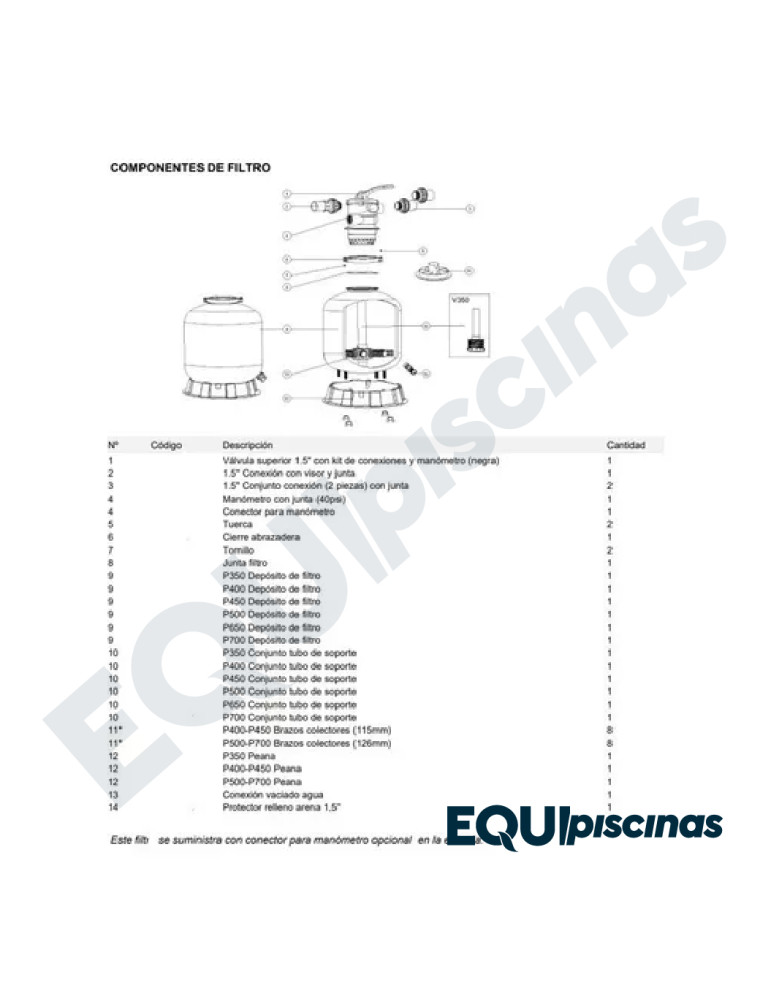 3) USO: ESTRUCTURA INTERNA DEL FILTRO SERIE P PARA FILTRACIÓN Y COLOCACIÓN DE DIFUSORES Y/O BRAZOS COLECTORES EMAUX; TRABAJA CON LA VÁVULA TOP