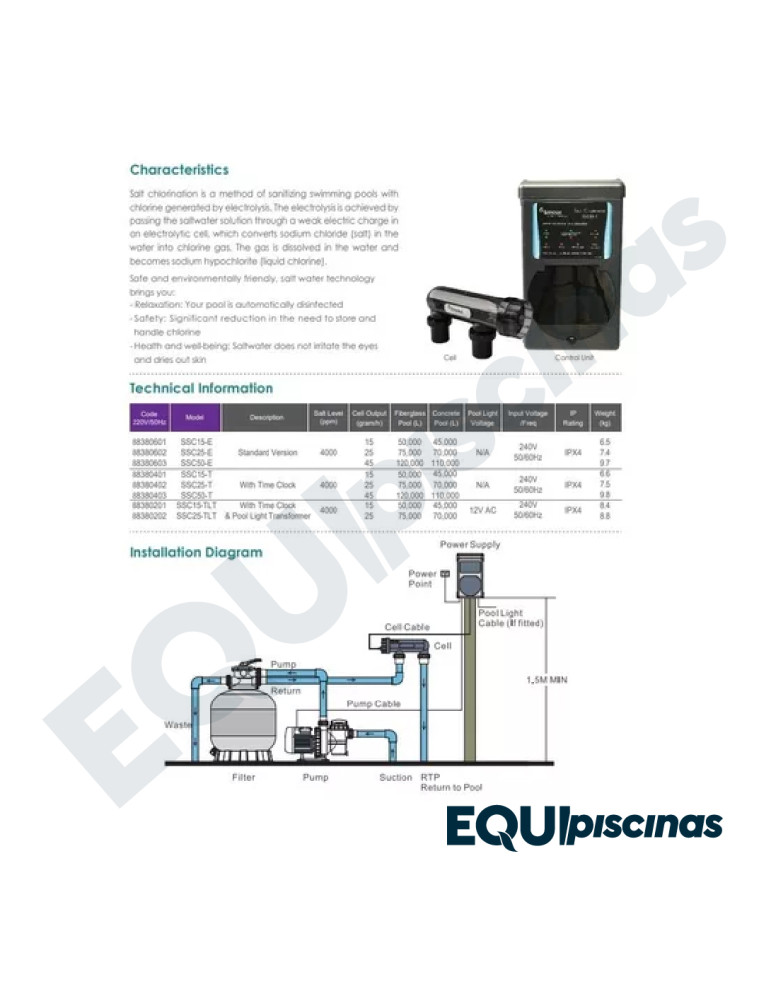 Los cloradores salinos de la serie SSC utilizan un método alternativo de desinfección de piscinas basado en el proceso de ELECTRÓLISIS. El proceso de electrolisis se realiza cuando la solución de agua salada pasa por la célula electrolítica, que convierte cloruro de sodio (sal) en dicloro (gas) que al disolverse en el agua se convierte en hipoclorito sódico (cloro liquido)